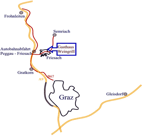 Von Graz kommend: Autobahn A9 Richtung Norden. Es gibt eine eigene Abfahrt "Friesach" - nach der Abfahrt rechts abbiegen. Nach etwa 1 km links einbiegen, der Weg führt Sie über eine Brücke Richtung Semriach Lurgrotte. Sie finden uns nach etwa 500m auf der linken Seite.
